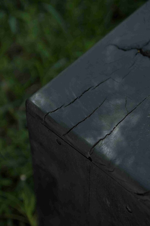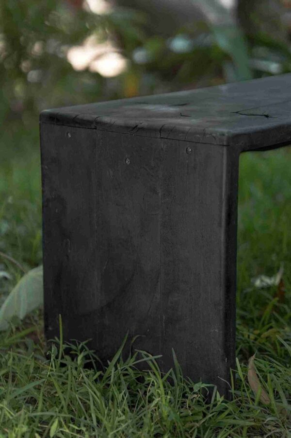 The signature characteristic of this piece is its charred finish. Through a meticulous fire-treatment process, the exterior of the teak is carbonized, revealing a rich, shadowed texture that enhances the wood’s natural grain with a sophisticated matte black sheen. Beyond its striking visual appeal, this charring acts as a biological shield—protecting the timber from rot, insects, and the harsh effects of sun and rain. This makes the Black Bench an ideal choice for outdoor galleries, tropical gardens, or high-traffic interior spaces.