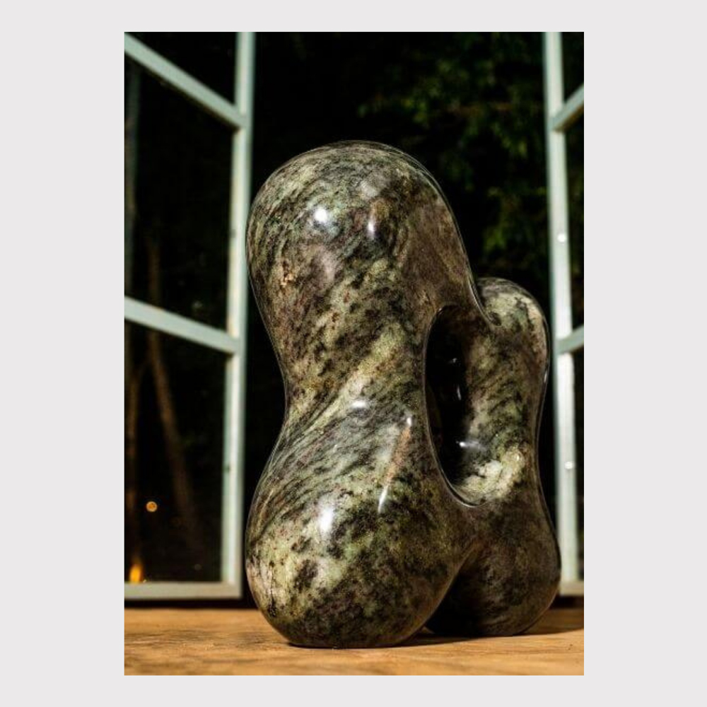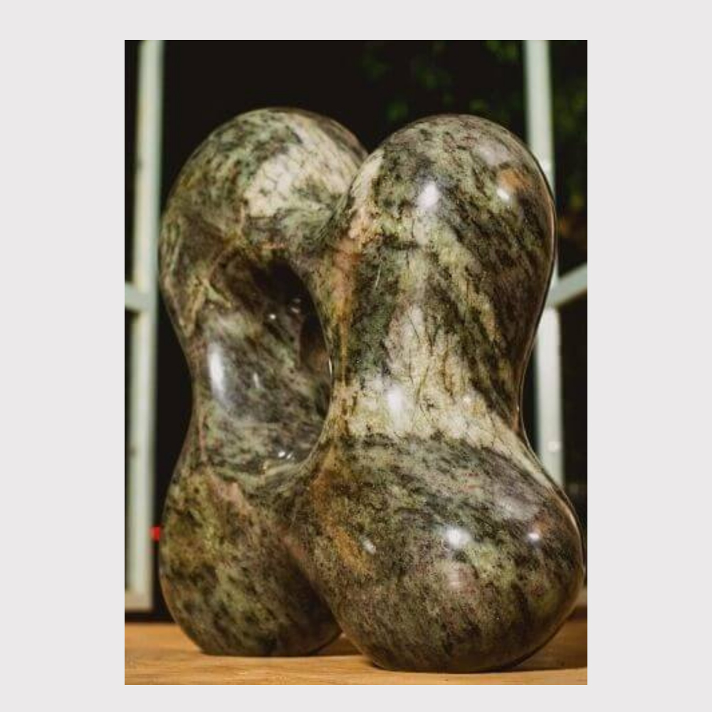 Finish: Hand-polished timber with a raw, textured stone pedestal