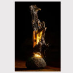 Calm in the Storm is more than a lighting fixture; it is a sculptural narrative of evolution and strength. The piece is centered on a dramatic vertical span of Pacific Rosewood, which has been carved and weathered to reveal deep, organic textures. These hollows and ridges represent the “storms” of life—circumstances and experiences that mold and refine an individual into a stronger, more resilient version of themselves.