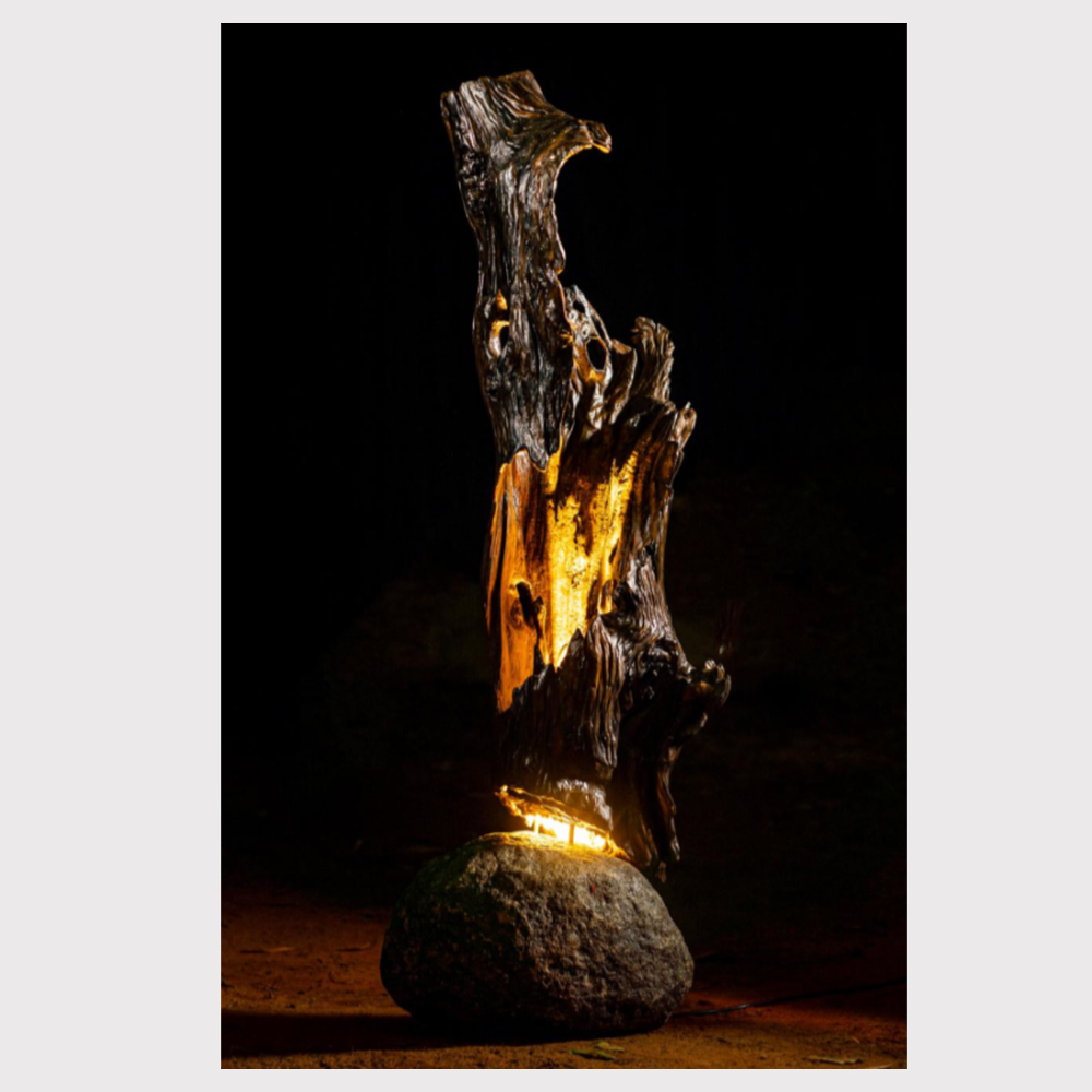 From within the heart of this ancient timber, a soft LED glow emanates, secured by discreet SS rods. This internal light serves as a metaphor for the enlightened ones who choose their battles wisely and radiate a sense of peace even in the face of adversity. The entire assembly is anchored by a massive Grey Granite boulder, providing a grounded, immovable foundation that mirrors the stability of a matured spirit.