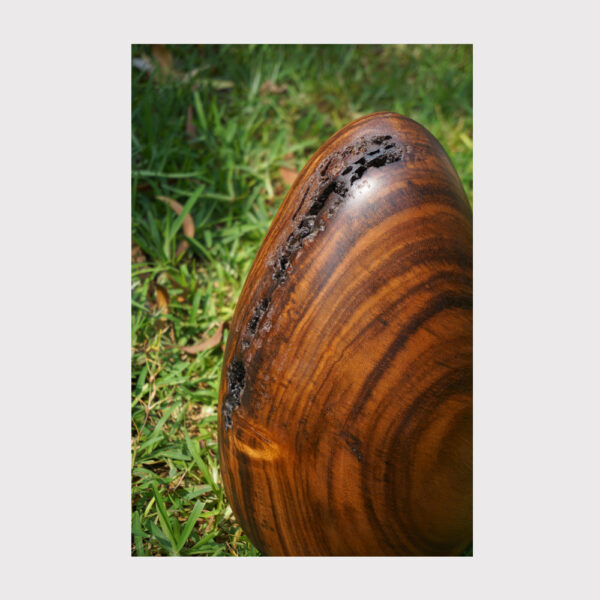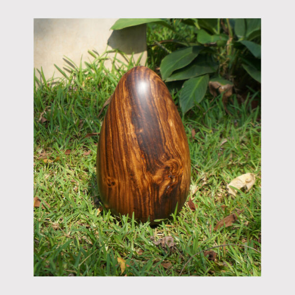 The design focuses on a perfect, vertical ovoid form, standing 15.5 inches (39 cm) tall. Its surface is polished to a mirror-like sheen, inviting the viewer to run their hands over its seamless contours. Conceptually, the piece is ideated on the grounds of “holding surprises within,” suggesting that the dense wood contains a hidden energy or a silent history that only reveals itself to those who take the time to explore its details.