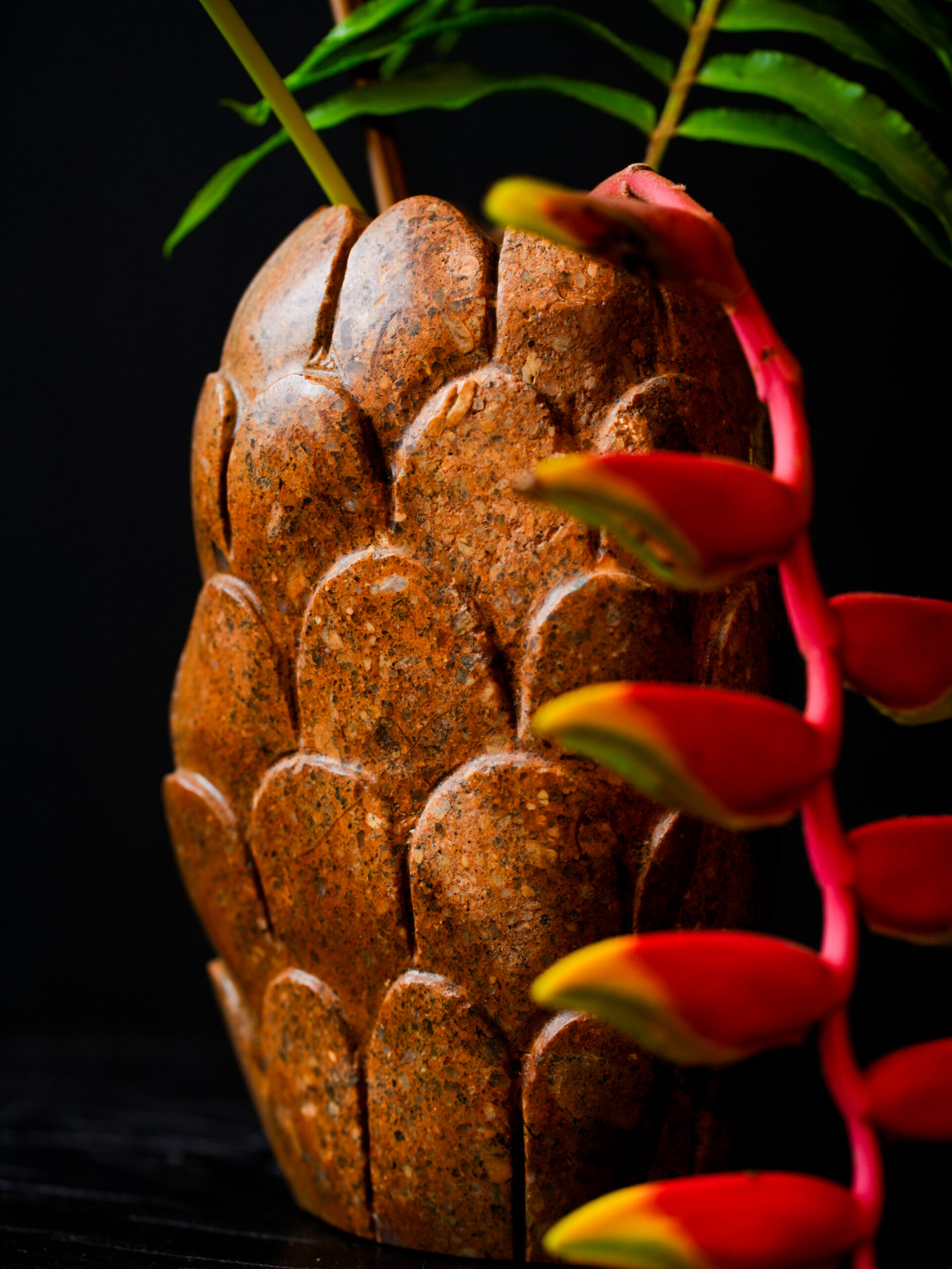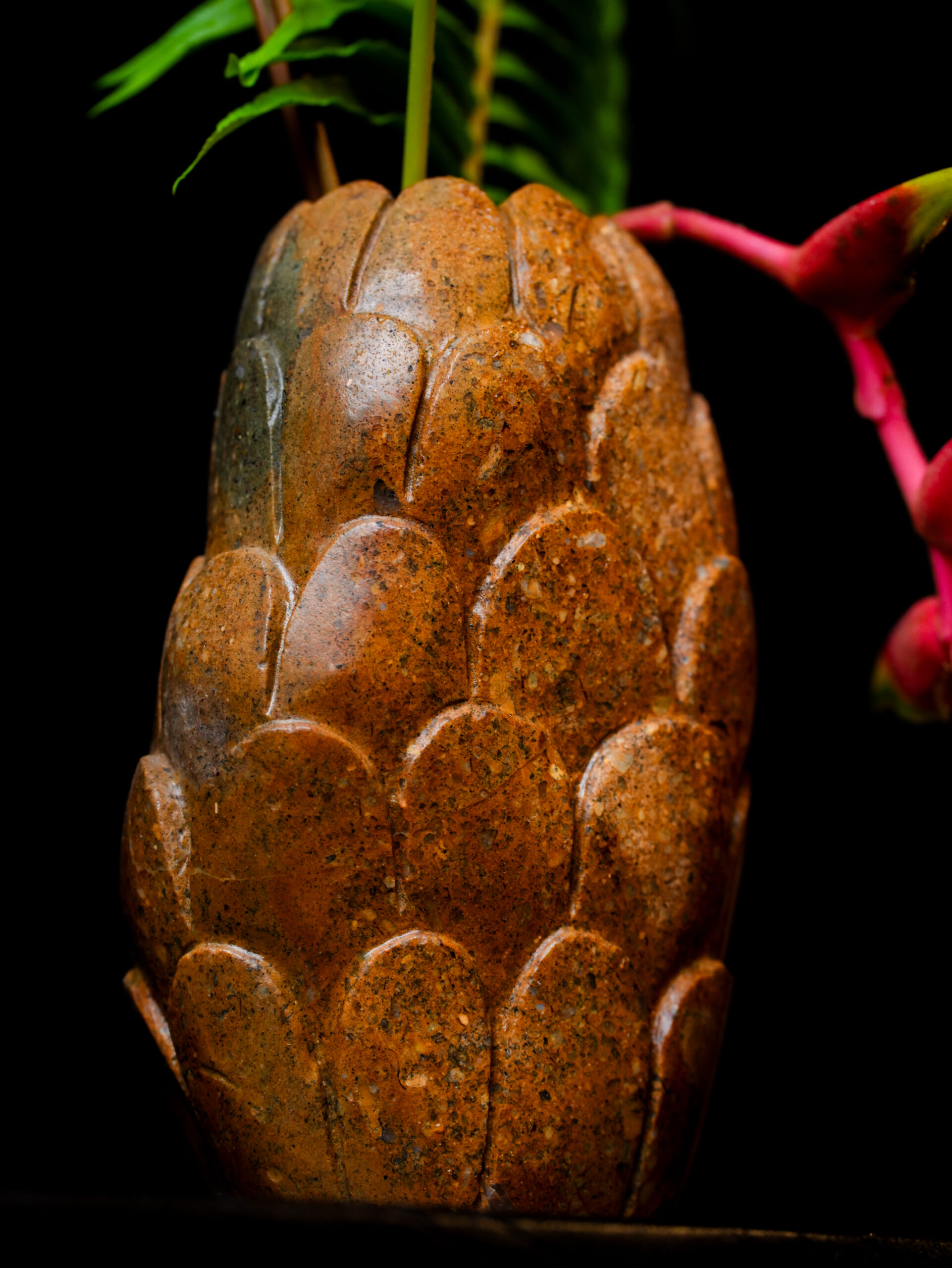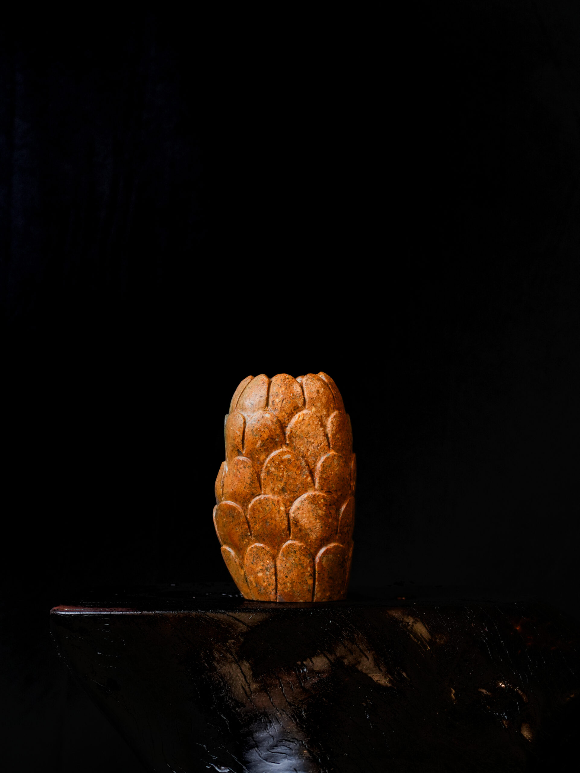 Standing at 9 inches high and 5 inches wide, the vase’s silhouette is defined by a rhythmic, hand-carved scale motif. This repetitive texture creates a captivating play of light and shadow, transforming the heavy stone into a fluid, tactile sculpture. The craftsmanship honors the integrity of the rock, leaving the interior and edges with a weighted, substantial feel that speaks to its high-end quality.