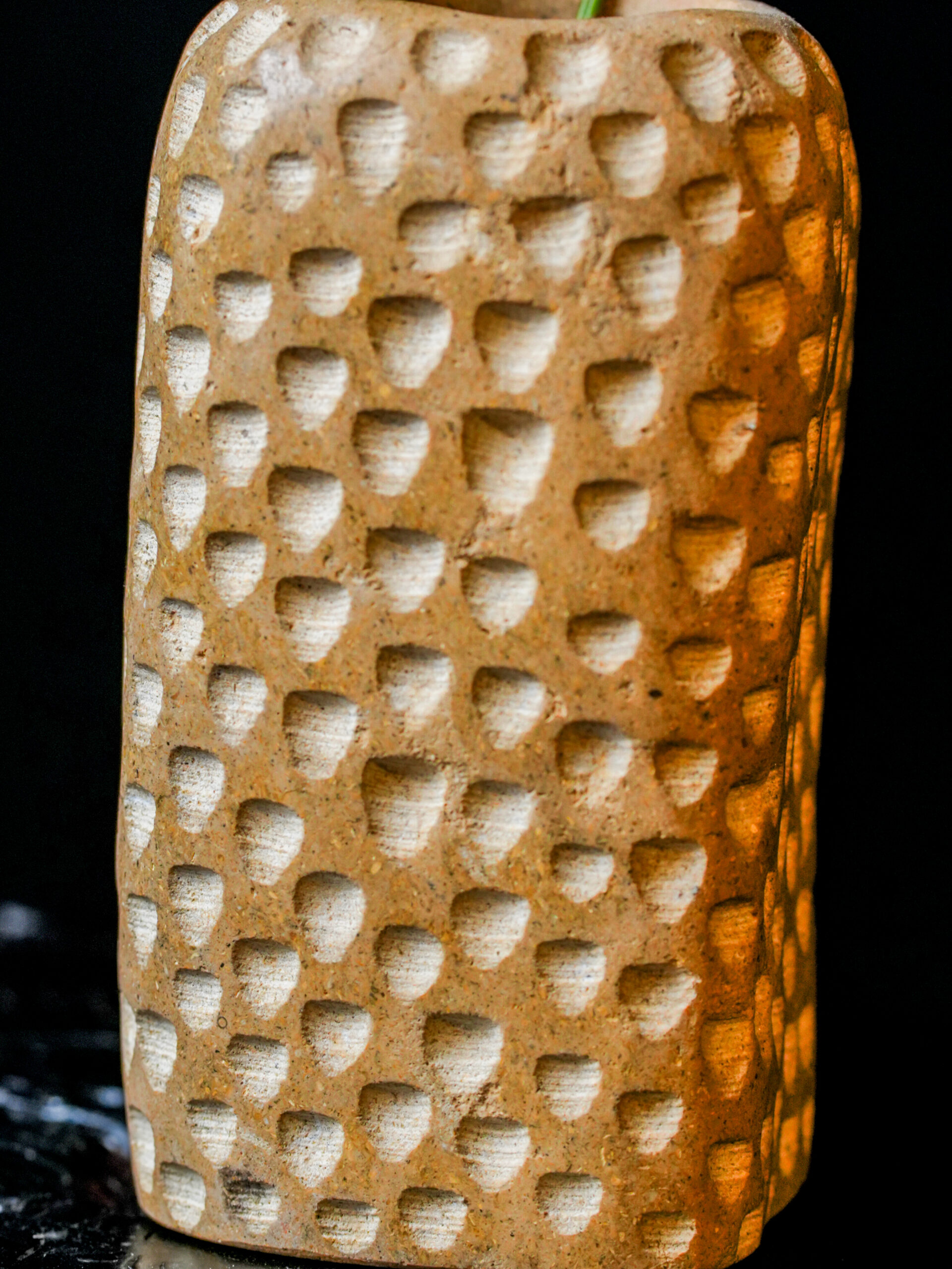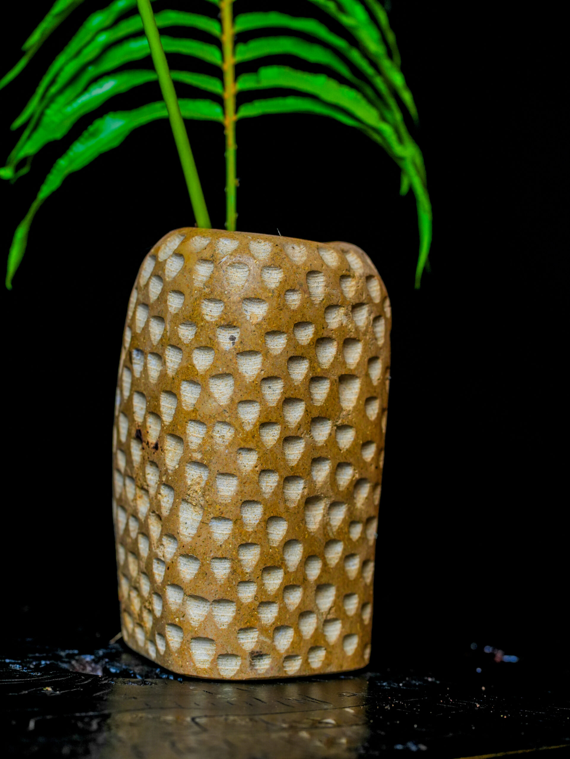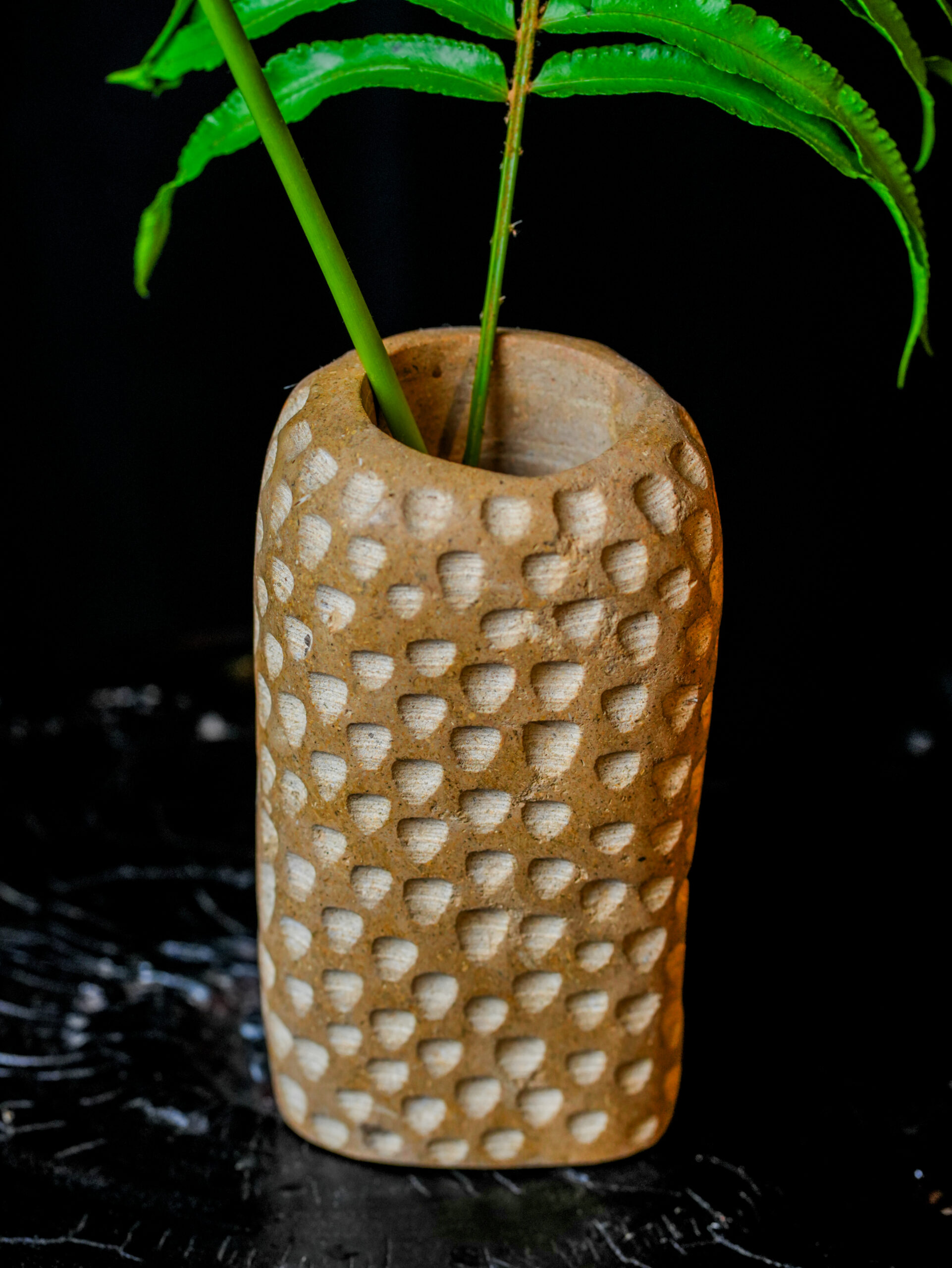 Part of our exclusive Limited Edition (VAS-GLOR) series, this vase is built for the discerning collector. Its substantial weight and dense mineral composition provide a sturdy foundation for structural botanicals like ferns or vibrant tropical stems, though it carries enough sculptural gravity to be displayed entirely on its own. Because each indentation is made by hand, no two vases in this series will ever be identical, offering you a unique artifact of both natural and human history. It is a timeless addition to a curated home, blending the primal energy of the earth with refined, modern craftsmanship.