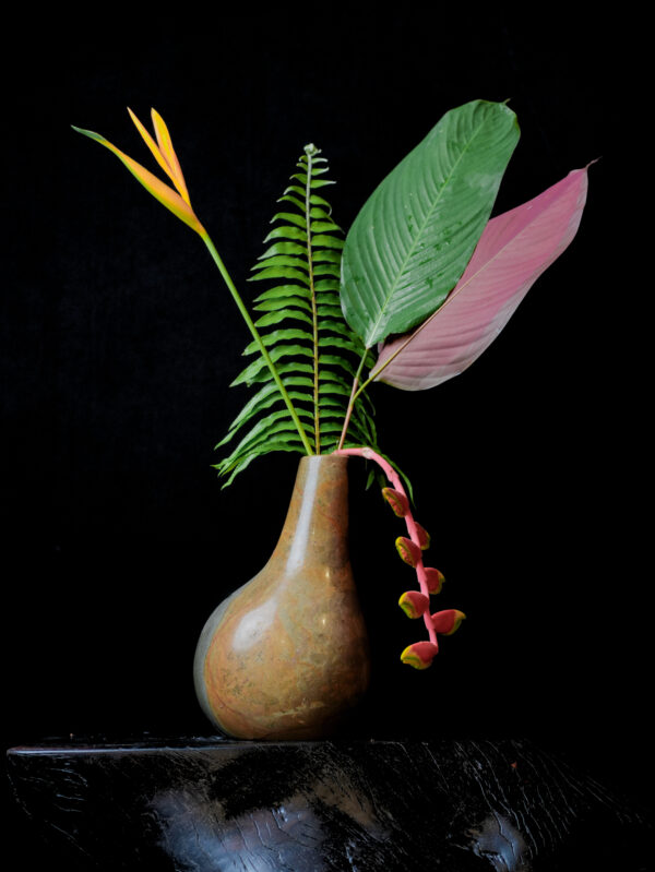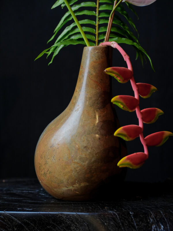 As part of the VAS-GLOR series, this teardrop variation is designed for those who appreciate “primitive-luxe” aesthetics. Its generous base provides exceptional stability, while the narrow, sloped aperture is perfectly suited for dramatic, structural botanicals—such as the lush ferns and vibrant tropical blossoms shown in our collection. Whether displayed on a minimalist gallery shelf or as a central mantle piece, this vase commands attention through its sheer authenticity and refined craftsmanship. It is more than a vessel; it is a timeless, functional sculpture that celebrates the enduring beauty of the natural world.
