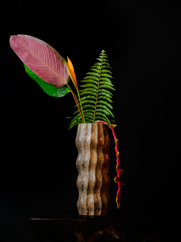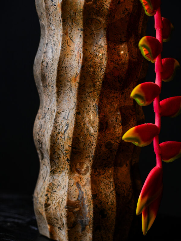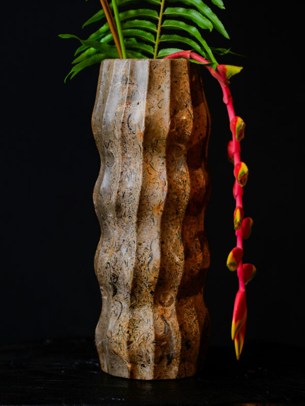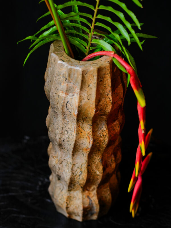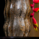 Measuring 9 inches in height with a 4-inch diameter, this variation focuses on verticality and movement. The distinctive wavy fluting is hand-chiseled to create a series of soft ridges and valleys, providing a tactile experience that invites touch. This rhythmic carving technique highlights the internal “movements” of the rock, making the heavy mineral appear light and fluid. The result is a piece that feels both prehistoric and avant-garde.