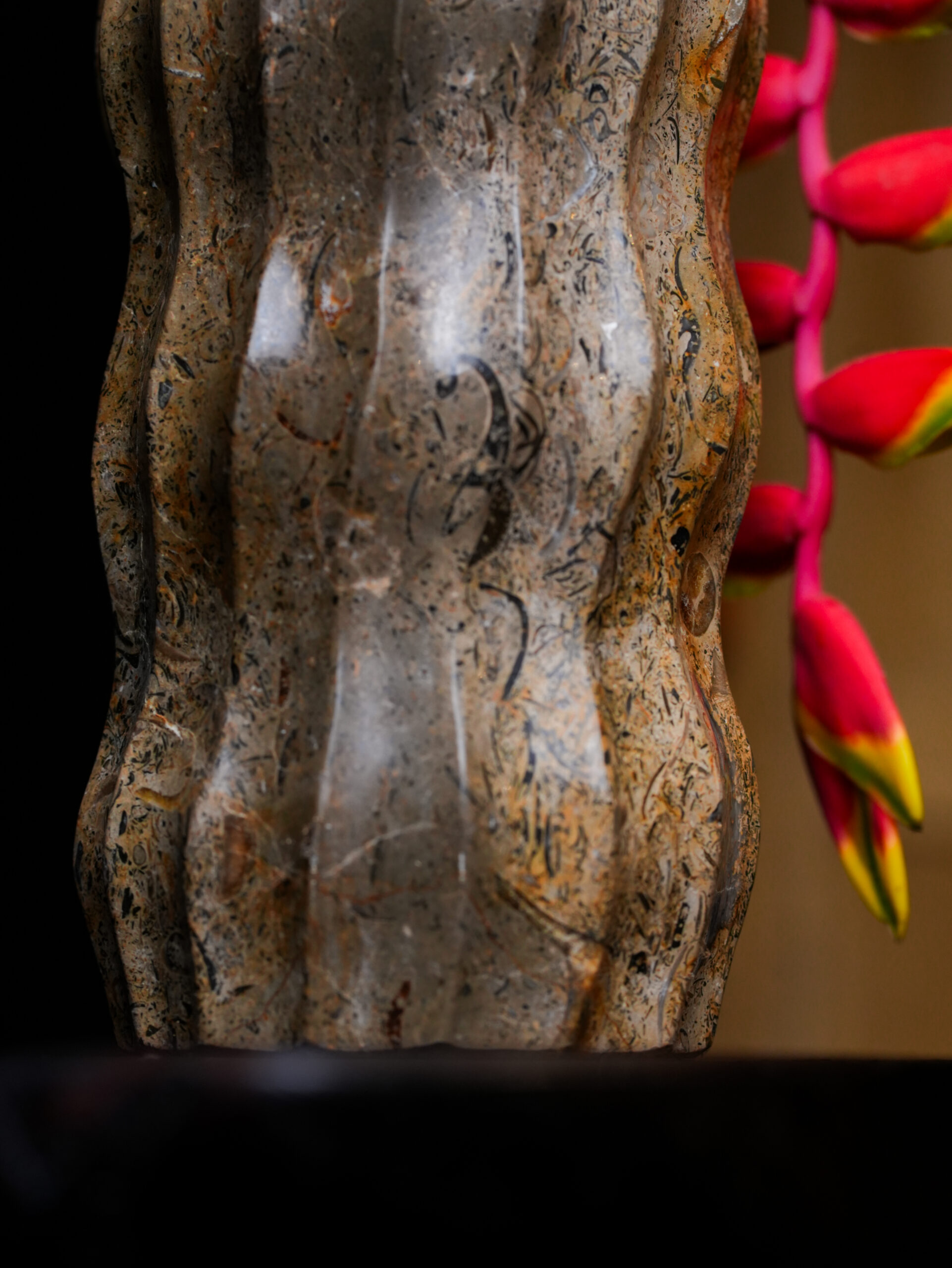 The Limited Edition Glauconite Rock Wavy Fluted Vase is a stunning celebration of texture and form. Carved from a single block of authentic glauconite, this vessel brings the geological narrative of the earth directly into your home. The stone itself is a marvel of natural art, featuring a speckled composition of warm tans, charcoal greys, and deep ferruginous reds that shift and change depending on the light.