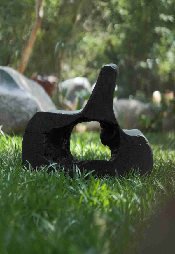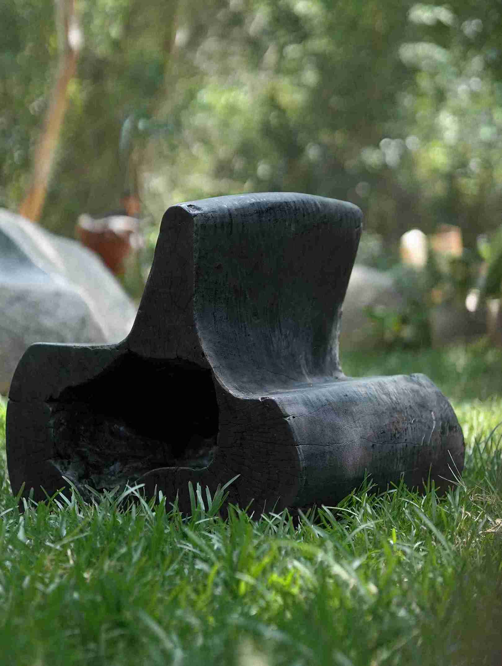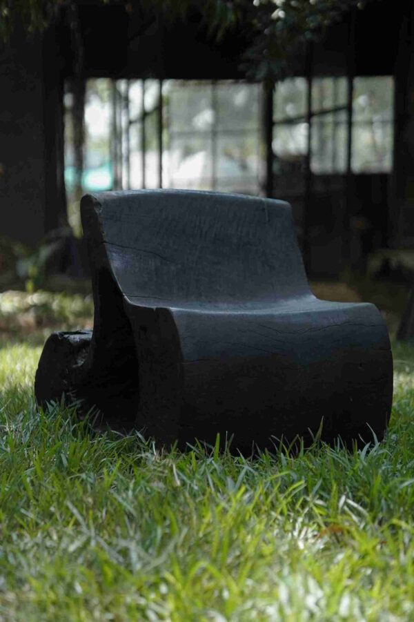 The chair’s most arresting feature is its monochrome charred finish. Utilizing a traditional burning technique, the surface is carefully scorched to create a rich, matte black patina. This process does more than just enhance the visual depth; the carbonization naturally preserves the Mango wood, providing a protective layer that is both durable and timeless. The result is a piece of furniture that feels as though it was forged by nature itself, carrying the quiet, charred elegance of a forest after a fire.
